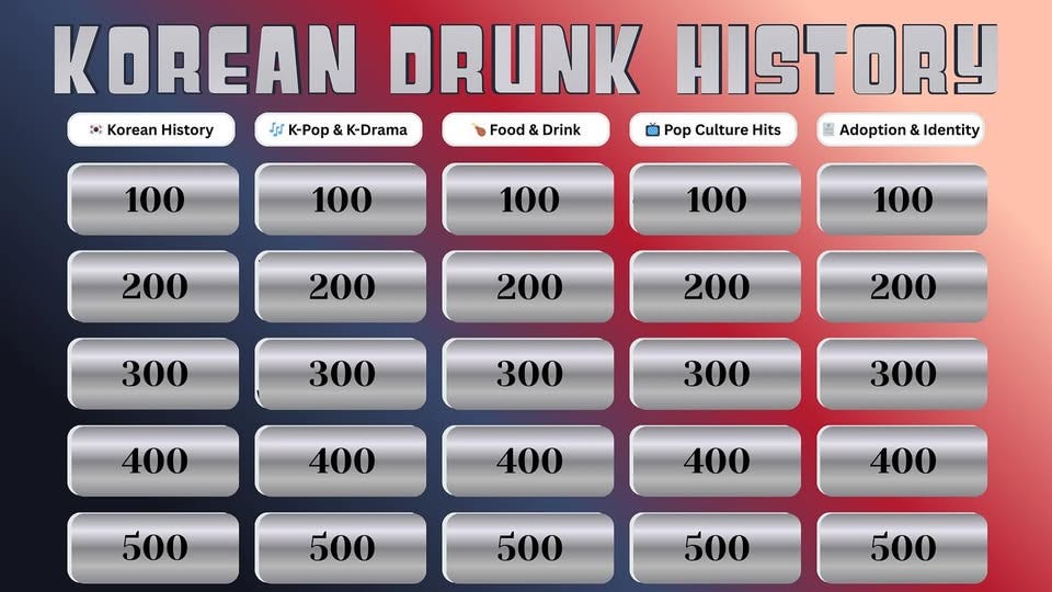 Oh! And if you’re a Korean adoptee and reading this before September 27, 2025, she’s hosting a virtual “Drunk Korean History” event at 8:00 p.m. EST. Grab an adult beverage and fill out the form to join!